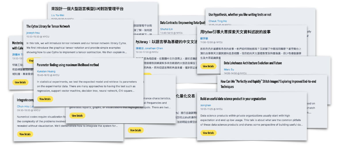 It would be unfair to say any of the talks is more exciting than others. But it is probably fair to say that data engineering and science is a major highlight of the conference. The technologies are used everywhere around us, for daily grocery shopping to high-tech manufacturing. Looking forward, sciwork continues to foster technical sharings and collaborative projects in all fields. Our partnerships with PyData and NumFOCUS strengthen our commitment to advancing data science and engineering. We will bring together a community of like-minded professionals to explore the technical frontiers.